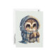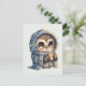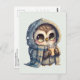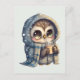 Postkarte mit kawaii-Abbildung einer großen mit Augen Eule in einem Winterrobe und Schal mit heißem Kaffee.