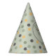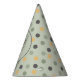 Beginnen Sie Ihren Geburtstag mit diesen niedlichen personalisierten Party Hüten. Sie sind mit einer adorable Abbildung eines Baby-Dinosauriers in hellgrün und gelb mit Ihrer eigenen Dino-Milbe-Nachricht vor allem Set vor einem Hintergrund von grünen, gelben und grauen Polka Punkte.
