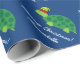 Niedliche grüne Elfschildkröte Weihnachtswackelpapier für Kinder. Niedliches Vektortierdesign mit lustigem Elfenhut. Personalisierte Geschenkpackung für Eltern, Kinder und Babys. Funny Illustration mit für den Winterurlaub. Fügen Sie Ihren eigenen Namen und individuelle Frohe Festtage wie Frohe Weihnachten oder glückliche Feiertage hinzu. Auch Spaß für das Xmas Baby Dusche Party. Anpassbare Hintergrundfarbe ist blau. Geschlechtsneutrales Design für Jungen und Mädchen.