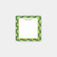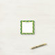 Klebrige Noten mit einem niedlichen Wiederholmuster mit olivgrünen Kleeblatten auf dunkelgrünem Hintergrund. Obergeschichtet ist ein weißes Quadrat mit einem goldenen Rahmen für Imitate.