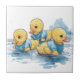 Gelbe gummigelbe Ente in blauer Kleidung in einer Wasserpfütze. Ideal für das Baby Kinderzimmer!
