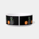 Diese phantastische Katzenschale zeichnet sich durch ein digitales Kunstbild einer niedlichen grauen Katze mit schwarzen Ohren, Nase und Mund und hellgrünen Augen aus. Die Katze trägt einen grünen Kragen mit einem leuchtend leuchtend orangefarbenen Edelsteincharm-Set in Gold. Die Katze sitzt neben einem orangefarbenen Kürbis.