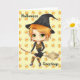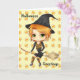 Niedliche Halloween-Chibi und ihr schwarzes Kätzchen fliegen auf einem Besen mit einem Bonbonuntergrund auf einer Grußkarte für Ihren eigenen Text. Anpassbar, sodass Sie den Text auf Wunsch ändern können.