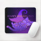 Niedlicher Halloween Cat mit lila Hexenhut und glücklichem Halloween-Text.