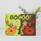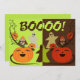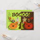 Personalisieren Sie Niedliche Boo Halloween Einladung mit sechs glücklichen Kürbissen, zwei Eulen und drei Gespenstern. Eine Hälfte ist hellgrün, die andere Hälfte dunkelbraun.