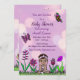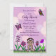 Niedliches Handgezeichnetes Baby, lila, Schmetterlinge, Blume und Bowling Baby Shower Einladungen. Dieses kleine ethnische Baby kann ein afroamerikanisches Mädchen darstellen.
