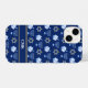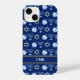 Schönes Hanukkah iPhone 14 Fall in hübsch blau mit einem coolen Muster Judaism star, dreidel für Spaß Chanukah-Spiele, und die jüdische Menorah. Passen Sie Ihr Monogramm zwischen den goldenen Linien in weiß an.