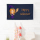 Glückliches Halloween-Banner mit einer niedlichen Hexe mit einem großen lila Hexenhut. Ihre schwarze Katze ruht oben auf ihrem Kopf. Sie hat langes orangefarbenes Haar und trägt einen Besen. Niedliche Cartoon-Abbildung perfekt für Halloween