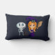 Ein Lumbalkissen mit einer niedlichen Hexe mit einem großen lila Hexenhut. Ihre schwarze Katze ruht oben auf ihrem Kopf. Sie hat langes orangefarbenes Haar und trägt einen Besen. Stehend neben ihr ist ein lustiges Skelett, das hallo lächelt und winkt. Niedliche Cartoon-Illustration perfekt für Halloween.