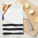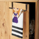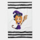 Ein Küchentuch mit einer niedlichen Hexe mit einem großen lila Hexenhut. Ihre schwarze Katze ruht oben auf ihrem Kopf. Sie hat langes orangefarbenes Haar und trägt einen Besen. Niedliche Cartoon-Illustration perfekt für Halloween.