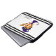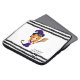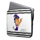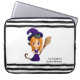 Personalisierter Laptop-Ärmel mit einer niedlichen Hexe mit einem großen lila Hexenhut. Ihre schwarze Katze ruht oben auf ihrem Kopf. Sie hat langes orangefarbenes Haar und trägt einen Besen. Niedliche Cartoon-Illustration perfekt für Halloween.