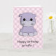 Obwohl ein Hippo nicht der häufigste Cartoon auf einer Grußkarte ist, sieht dieser Kerl mit seinen freundlichen großen schwarzen Augen niedlich aus. Der Hintergrund ist ein lila-rosa Muster, das der Geburtstagskarte eine mädchenhafte Touch verleiht.