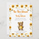 Mit dieser Einladung laden wir Freunde und Familie ein, Ihre Babydusche zu feiern, mit einem niedlichen Teddybär, der wie eine Honigbiene gekleidet ist. Zwei Bienen fliegen in der Nähe des Wortes "Ba-Bee-Dusche" vor einem Hintergrund hübsch braun zentrierter gelber Blumen. Alle Texte können einfach auf Ihre Informationen geändert werden.