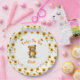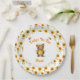 Ein niedlicher Teddybär, der wie eine Honigbiene gekleidet ist. Zwei Bienen fliegen über dem Text vor einem Hintergrund hübsch braun zentrierter gelber Blumen. Alle Texte können einfach auf Ihre Informationen geändert werden.