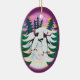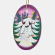 Ein lustiges Oval-Ornament mit zwei niedlichen Pinguinen, die Spaß haben, Eis-Skaten, in einer schneebedeckten Landschaft mit Tannenbäumen und einer untergehenden Sonne; von einer handbemalten Papierkollektion von Judy Adamson.