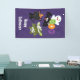 Ein halbes Banner mit einem schwarzen fliegenden Fledermaus, eine grüne Mummy-Fledermaus mit weißer Bandage und eine niedliche schwarze Katze mit einem orangefarbenen Hexenhut. Boo schrieb in lustigen bunten Briefen mit einem glücklichen Geist, der dahinter schwebte. Dunkler lila Hintergrund.