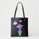 Einzigartige Tasche mit einer niedlichen Katze in einem Hut und fliegenden Untertassen nur auf der Vorderseite auf schwarzem Sternenhimmel. Die himmlische Katze ist hellblau und trägt einen violetten Hut.