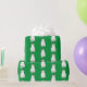 Festliche Verpackung mit handgezeichneten niedlichen Katzen, die mit einer Reihe von Weihnachtsbeleuchtung auf grünem Hintergrund umwickelt werden