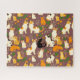 Puzzle in einem skurrilen Muster von Katzen in natürlichen Posen, umgeben von grünem Blattwerk und Blume, Set vor einem kaffeebräunlichen Hintergrund und schafft eine charmante und gemütliche Ästhetik.