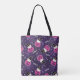 Eine Tasche mit einem schönen Halloween-Motiv. Katzen in Hexenhüten, sitzen auf rosa Kürbissen mit lila Spinnweben im Hintergrund.