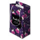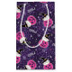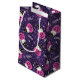Eine Geschenktasche mit einem schönen Halloween-Motivmuster. Katzen in Hexenhüten, sitzen auf rosa Kürbissen mit lila Spinnweben im Hintergrund.