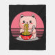 Farbige Abbildung einer niedlichen, rosa Kawaii-Katze, die auf einem Streifen pinkfarbenen Sonnenuntergang aus einer roten Schüssel ramen isst