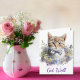 Niedliche Sitte werden gut Grußkarte, mit Aquarellkunst eines niedlichen Tabby-Kätzchens, mit einer Bogen-Krawatte, sitzen in einem Bett oder Wildblumen. Personalisieren Sie den Text, um zu lesen, was Sie gewollt haben.