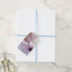 Personalisierte Geschenketiketten mit einem Foto eines Ingwer-Kätzchens, das auf einer weichen, weißen und roten Weihnachtsmannmütze sitzt. Unscharfe glitzernde Lichter auf beide Seiten. Funny pun - Meowy Weihnachten. Text ist editierbar, damit Sie ihn so ändern können, dass er sagt, was immer Sie wollen.