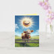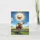Eine niedliche Abbildung einer Kuh, die mit einer hellen Sonne über dem Lächeln lächelt und joggt. Das Innere sagt: Mooo-chas Gracias! Mit anderen Worten: "Muchas Gracias! Wie immer du es sagst, sag "Danke" mit dieser schönen Karte.