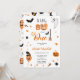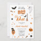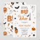 Ein bisschen Boo ist fast fällig! Adorable niedliche Boo Halloween Illustrationen Babydusche, vollkommenes Halloween-Party auf Weiß, mit niedlichen Illustrationen mit Gespenstern und Boobüsten bemalten Donuts mit Hexenhüten, Besen, niedlichem Ghost, geschnitzten Kürbis, Ballon, Spinne und Fledermäuse. Eine schöne Halloween-Illustration.