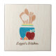 Fügen Sie eine Touch von hominess Ihrer Küche mit dieser niedlichen Landartfliese hinzu, die ein Hand gezeichnetes Art-Set hölzerne Löffel und Küchengeräte in einem Türkistopf kennzeichnet, der durch einen köstlichen roten Apfel und eine frische Frucht umgeben wird. Dieser themed Entwurf der Landküche auf einem hellen hölzernen Musterhintergrund kann personalisiert sein, indem er Ihren Namen addiert.