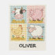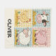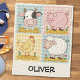 Diese spielerische Decke enthält ein Quartett klassischer Nutztiere - eine Kuh, ein Schwein, ein Huhn und ein Schaf - jedes Set vor einem bunten, strukturierten Gingham-Hintergrund.