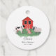 Niedliches Bauernthema Baby Dusche Gefälligkeitsmarke mit Illustrationen von Kuh, Schwein und einem Schaf vor einer roten Scheune. Ideal für eine Country-Themenparty mit Mädchen und Jungen.
