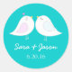 Niedliche Liebesvögel Hochzeitsaufkleber auf einem Aqua-Hintergrund. Passen Sie die Formulierung an Ihre Bedürfnisse an. Die Hintergrundfarbe kann geändert werden, indem Sie die Schaltfläche Anpassen und bearbeiten wählen. Unter www.zazzle.com/daisylin712 finden Sie die passenden Einladungen für Hochzeiten, UAWG, Dankeschön-Karten und vieles mehr.