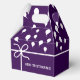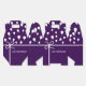Benutzerdefinierte, dunkle lila Gefälligkeitsboxen. Weiße Bänder und Party-Ballons entwerfen. Bearbeiten Sie den Namen auf personalisiert. Idee der Geburtstagsparty.