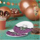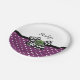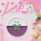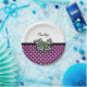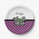 Zeigen Sie Ihren Party-Stil mit diesen niedlichen lila-weiß-polka Dot-Tellern mit einem trendigen Zickzack Schwarz-Weiß-Bogen und einer schicken grünen Band-Rose. Geben Sie diesem lila und grünen Retro trifft modernes Design eine personalisierte Touch, indem Sie den Namen Ihres Teenagers. Flachdruckbild, KEIN tatsächliches Rosettenband und Bogen.