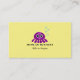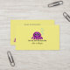 Ein Visitenkartendesign, das speziell für Unternehmen geeignet ist, die von einem Quallendesign im Stil eines Cartoon profitieren können. Eine niedliche kleine Cartoon-Illustration einer lila Qualle mit rosa Flecken und großen Kawaii-Augen, kleine blaue Wasserblasen, die über ihrem Kopf schweben. Set auf hellgelbem Hintergrund.