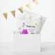 Niedliche lila Katze auf rosa Hintergrund mit Herz und Ballons für Geburtstagsparty