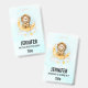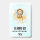 Ein Namensschild mit einer niedlichen Aquarellbilder. Ein bezaubernder Löwe, der eine Kronfischerei für Sterne trägt, die auf einem Halbmond sitzen und auf einer flauschigen Wolke ruhen. Magische Fantasy-Illustration. Hellblauer Aquarell.