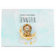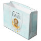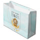 Große Geschenktasche mit einer niedlichen Aquarellbilder. Ein bezaubernder Löwe, der eine Kronfischerei für Sterne trägt, die auf einem Halbmond sitzen und auf einer flauschigen Wolke ruhen. Magische Fantasy-Illustration. Hellblauer Aquarell.