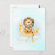 Eine Postkarte mit einer niedlichen Aquarellbilder. Ein bezaubernder Löwe, der eine Kronfischerei für Sterne trägt, die auf einem Halbmond sitzen und auf einer flauschigen Wolke ruhen. Ein Haufen Imitate Goldfolie stern unter der flauschigen Wolke. Magische Fantasy-Illustration. Hellblauer Aquarell.