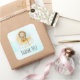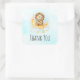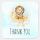 Vielen Dank an Aufkleber mit einer niedlichen Aquarellbilder. Ein bezaubernder Löwe, der eine Kronfischerei für Sterne trägt, die auf einem Halbmond sitzen und auf einer flauschigen Wolke ruhen. Magische Fantasy-Illustration. Hellblauer Aquarell.
