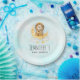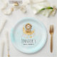 Baby Duschpapier Teller mit einer niedlichen Aquarellbilder. Ein bezaubernder Löwe, der eine Kronfischerei für Sterne trägt, die auf einem Halbmond sitzen und auf einer flauschigen Wolke ruhen. Ein Haufen vergoldeter Sterne von Imitaten an den Wolken verleihen diesem Design ein magisches Gefühl. Hellblauer Aquarell.