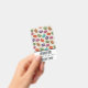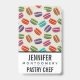 Benennen Sie Abzeichen mit einem niedlichen Makaronmuster in vielen verschiedenen Farben, mit einem schwachen Polka Punktmuster dahinter.