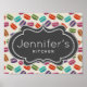 Ein Poster mit einem niedlichen Makaronmuster in vielen verschiedenen Farben mit einem schwachen Polka-Punktmuster. Ein extravaganter, Vintag aussehender, schwarz-weißer Zierrahmen mit dem Text im Inneren.