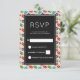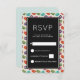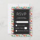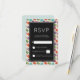 RSVP-Karte mit einem niedlichen Makaronmuster in vielen verschiedenen Farben mit einem schwachen Polka Punktmuster dahinter. Ein schwarzes Rechteck, das oben mit dem UAWG überlagert ist. Weiße Schachteln auf schwarz machen es Ihren Gästen leicht, ihre Antworten auszufüllen.
