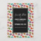 Eine Save the Date Postkarte aus Party mit niedlichem Makaronmuster in vielen verschiedenen Farben mit einem schwachen Polka Punktmuster dahinter. Ein schwarzes Rechteck, das oben mit dem Text übereinander liegt.
