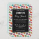 Eine Babyduscheinladung mit niedlichem Makaronmuster in vielen verschiedenen Farben mit einem schwachen Polka-Punktmuster. Oben platziert ist ein schwarzes Rechteck, in dem sich die Details des Party befinden.