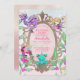 Diese zauberhafte und bezaubernde Party Einladung besticht durch ein farbenprächtiges Thema im Regenbogenmärchen. In der Mitte befindet sich ein großer vergoldeter Spiegelrahmen mit zwei niedlichen kleinen Feen, die um ihn herum schwelgen. Ein lila Drache wird in der oberen links Ecke platziert, und eine Prinzessin sitzt unten am Spiegel. Die skurrile Szene zeichnet sich durch Akzente aus farbigem und goldenem Glitzer, goldgeflochtene Elemente und märchenhafte Lichter an der Grenze aus.