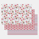 Ein Trio von passenden Verpackungspapierblättern mit einem medizinischen Thema. Ein Merkmal ist ein niedliches Muster von Thermometern, Stethoskopen, Bandaien, Herzen mit einer EKG-Kurve und Medizin auf weißem Hintergrund. Ein Muster der Herzen mit Ekg-Kurven. Und man hat passende Streifen in Rot, Weiß und Blassblau.